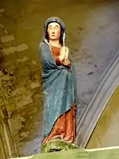 - La statuette d'un ange céroféraire, au chevet du collatéral nord, est en bois polychrome. Elle mesure 69 cm de hauteur, et date du XVIe siècle. Sa polychromie est en partie moderne, et elle a probablement perdu les ailes, raison pour laquelle elle a été classée en tant que statue d'un diacre en mars 1966. Or, en regardant de près, l'habit n'est pas celui d'un diacre, et le personnage a les pieds nus, ce qui est généralement réservé au Christ, aux Apôtres et aux anges. De toute façon, l'on n'a pas coutume de représenter les diacres portant des cierges[11].