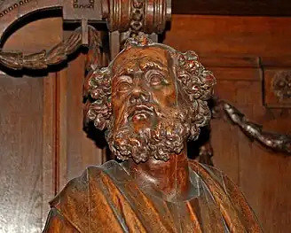 La chaire en bois de chêne n'est pas adossée à un pilier de la nef comme s'est souvent le cas mais est portée par un remarquable groupe sculpté composé de figures du tétramorphe : l'homme ailé ou l'ange, l'aigle et le taureau (les symboles traditionnels des quatre évangélistes). Sa cuve est décorée de panneaux sculptés et surmontée d'un abat-voix orné de la représentation du Saint-Esprit entouré de rayons de lumière.