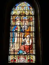 - et les vitraux. Sur le premier vitrail du sud, sainte Edwige prend les traits de Louise Radziwiłł, et porte le collier de perles qu'elle affectionna tant. La plupart des vitraux se sont avérés être de mauvaise qualité, et le décor peint est déjà à moitié effacé.