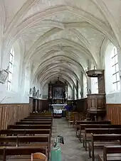 Le vaisseau principal est stylistiquement homogène sur toute sa longueur, et ne montre pas de distinction architecturale entre nef des fidèles et chœur liturgique. C'est une simple salle rectangulaire voutée d'ogives. Eugène Müller parle d'une église sans caractère, et son intérêt archéologique et artistique est quasi nul, si ce n'est que l'église représente l'un des derniers cas de l'application du voûtement d'ogives dans la région, et une manifestation très tardive du style gothique flamboyant, à une époque que même le style qui lui succède, celui de la Renaissance, est arrivé à sa fin. Comme seule particularité, l'on observe le nombre élevé des travées par rapport à la longueur modeste de l'édifice, ce qui donne des travées très courtes et resserrées, qui se succèdent à un rythme rapide. L'éclairage par la lumière naturelle est assuré par neuf fenêtres, soit une au nord et une au sud de la seconde à la quatrième travée, et une au sud seulement de la cinquième à la dernière travée. Elles s'inscrivent presque entièrement sous la lunette des voûtes. Ces fenêtres sont en plein cintre, relativement grandes, dépourvues de remplage et non décorées. Il n'y a pas non plus de vitraux polychromes, que ce soit du XIXe siècle. Le mur occidental est percé d'un oculus en hauteur. Les nervures des voûtes pénètrent directement dans les murs, le maître d'œuvre ayant fait l'économie de piliers engagés ou de consoles. Elles se caractérisent par une modénature aigüe, atypique pour l'époque de construction supposée. De même, le tracé en arc brisé adopté par les arcs-doubleaux. Les ogives et les formerets sont en revanche en plein cintre. Aucune des clés de voûte n'est décorée, ou montre les traces d'une décoration disparue : les ogives s'y croisent tout simplement. Quant à la chapelle seigneuriale devenue chapelle de la Vierge, elle s'ouvre par deux arcades en plein cintre non moulurées, dans la cinquième et la sixième travée. Bien que correspondant, dans le sens longitudinal, à deux travées de la nef, elle est munie d'une seule voûte d'ogives, dont les nervures affichent un profil prismatique, et sont reçues sur des culots non décorées dans les quatre extrémités. La clé de voûte est armoriée, mais ce décor est seulement peint et fait partie d'une polychromie architecturale du XIXe siècle. L'unique fenêtre, au nord, est plus large que les autres, et se distingue par un arc en tiers-point[5],[9].