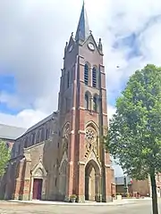 La nouvelle église fut construite à l’initiative de l'abbé L. Couvreur, curé de la paroisse de 1881 à 1905, en brique en style néo-gothique très prisé à l'époque, selon un plan basilical traditionnel avec nef à deux bas-côtés, transept et chœur. Le clocher-porche est surmonté d'un toit en flèche. La façade principale est percée de trois portails ; le portail central est abrité par un porche surmonté du clocher.