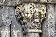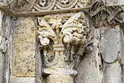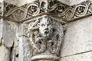 Au-dessus du portail la corniche est formée par un treillis végétal continu sur toute la largeur de la façade. Ce superbe encorbellement est scandé par quinze modillons et deux pairs de chapiteaux, suivant la formule décorative qui a été calquée sur la façade de l'Abbaye mère de Sainte-Croix à Bordeaux. Il date de 1150.