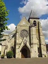À droite, le porche fait corps avec la tourelle d'escalier, qui est aussi élevée que les murs gouttereaux de la nef. À gauche, le contrefort occidental de la nef est accolé au porche. Il est scandé par un petit larmier au niveau de la retombée du gâble, ainsi que par un larmier présent sur les trois faces à mi-hauteur. Ce même larmier apparaît également sur les élévations latérales, la tourelle d'escalier, et les contreforts d'angle du clocher, dont l'un montre aussi le petit larmier. Le contrefort s'amortit par un glacis formant larmier. La lancette qui éclaire le bas-côté nord est entourée d'un double ressaut chanfreiné. Le demi-pignon du bas-côté est dominé par un arc-boutant à simple volée. Établie dans le prolongement du premier contrefort septentrional du bas-côté nord, sa culée est coiffé d'un chaperon en bâtière, et munie d'une petite gargouille. Le contrefort occidental du bas-côté présente une retraite par un larmier après les premières assises, caractéristique partagé par les élévations latérales, et s'amortit par un glacis formant larmier. Il est encore bien visible que le clocher englobe un arc-boutant analogue. Ses contreforts ont été conçus sans rupture de style. Une baie bouchée en arc brisé, fortement ébrasée, existe au niveau du premier étage, qui correspond aux combles du bas-côté sud. Selon Maryse Bideault et Claudine Lautier, elle provient d'une structure plus ancienne, dont la finalité reste à déterminer. L'étage suivant est aveugle. L'étage de beffroi est d'un style éclectique, avec un pilastre plat à gauche, et des demi-colonnettes engagées dans les contreforts d'angle sud-ouest et sud-est et leurs glacis. L'on relève une baie abat-son en plein cintre à l'ouest et à l'est, mais deux au sud. La corniche est formée par un entablement ébauché avec un rang de denticules. Le toit à la hache est couvert d'ardoise[10],[11],[12].