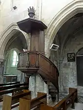 - La chaire à prêcher en bois taillé, poli et ciré date du XVIIIe siècle. Elle est suspendue sur le troisième pilier des grandes arcades du sud. La cuve, qui est de plan trapézoïdal (et non réellement octogonal), est décorée de quatre balustres sous la forme d'ailerons appliqués, et présente trois panneaux de style Rocaille. En dessous, la cuve arbore un cul-de-lampe orné de feuillages. Le dorsal est peint d'un Christ en croix, avec un serpent qui s'apprête à grimper sur le crucifix. L'abat-voix est couronné d'un pot à feu dont émanent des rayons de lumière (et non des flammes). La chaire est classée depuis 1966, et conservée en bon état[17].