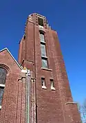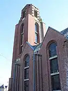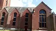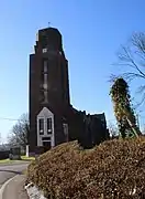 L'ancienne église était construite en brique ornée de pierre calcaire sur les deux contreforts en façade du clocher.