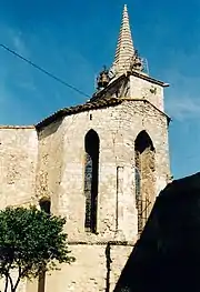 Le chevet pentagonal, construit en pierre de taille, présente une base romane et une partie supérieure de style ogival.