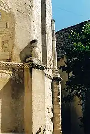 La corniche qui surmontait ces colonnes à l'époque romane a disparu vu que le chevet a été rehaussé à l'époque gothique. De même, certaines des baies romanes ont été transformées en baies ogivales.
