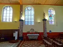 Tout ce qu'il y a comme supports sont des colonnes engagées en faux marbre rouge entre la quatrième et la cinquième travée de la nef au sud, et à l'intersection entre nef et chœur, au nord et au sud. Ces deux dernières colonnes sont surmontées d'un pilastre plat, également en faux marbre rouge, et les deux pilastres sont reliés l'un à l'autre moyennant une poutre (une autre poutre marque le début de l'abside). Les colonnes sont dépourvues de bases, et reposent sur des socles carrés peints en noir. Elles portent des chapiteaux dérivés de l'ordre toscan, également peints en noir. La vocation de ces colonnes ne pouvait être que décorative, et selon Bernard Duhamel, elle n'auraient été ajoutées au XVIIIe siècle[8], ce qui est suggéré par leur style. L'on est ainsi face à un chœur qui n'a apparemment jamais été destiné à être voûté, comme tendent à le confirmer l'absence de contreforts saillants à partir de la cinquième travée. Rarement l'architecture d'un sanctuaire fait preuve de si peu d'ambition. Dans le Vexin français, l'on peut néanmoins signaler le chœur gothique de Berville, et un peu plus loin dans l'Oise, le chœur Renaissance de Lamorlaye.