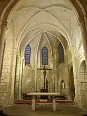 Entre les deux travées, le doubleau, les ogives et les formerets sont reçus tous ensemble sur le tailloir à bec d'un chapiteau de crochets de la même forme, dont le fût unique mesure 22 cm de diamètre. Les tailloirs à bec n'apparaissent pas avant les années 1220. On en voit à la Sainte-Chapelle de Paris, à Saint-Jacques de Compiègne, Genainville, Nogent-sur-Oise et Saint-Martin-aux-Bois. Dans les angles de l'abside, les quatre autres ogives et les formerets retombent sur les tailloirs carrés placés en pointe de colonnettes à chapiteaux, qui ont 19 cm de diamètre. Tous les fûts du chœur sont en délit, avec trois à cinq tambours par colonnette. Les voûtes restent couvertes de badigeons, et sont peintes en faux-appareil, tandis que les pierres de taille sont généralement apparentes sur les murs, sauf au niveau de la fenêtre d'axe. Louis Régnier pense que toutes les parties badigeonnées auraient été refaites à une période inconnue, au XIXe siècle. Les ogives et l'arc-doubleau séparant les deux travées de l'abside sont au profil d'un tore en forme d'amande. Les deux clés de voûte sans des petites rosaces. — Le chœur n'a plus que trois fenêtres, celles du chevet. Elles sont en tiers-point, et s'ouvrent au-dessus d'un long glacis. Une ancienne piscine liturgique subsiste dans le soubassement de la baie de droite. Deux fenêtres bouchées existent au sud (donc même dans le mur du clocher), et une au nord, au moins partiellement, dans la seconde travée. La partie inférieure a été supprimée avec le percement de l'arcade vers la chapelle septentrionale. Cette arcade, et celle un peu plus large dans la première travée, ne sont pas moulurées, et dépourvues de supports. Au sud, la basse arcade en plein cintre vers la base du clocher est romane, tandis que l'arcade reliant la seconde travée à l'abside méridionale n'existe sous cette forme que depuis 1925[12].