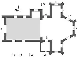 La sacristie se trouvait auparavant du côté nord (no 5 du plan). Elle fut transférée en 1828 du côté sud (no 6 du plan). Les vestiges de l’ancienne sacristie restent visibles sur la façade nord.