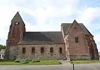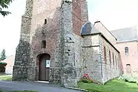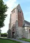 L'église fortifiée (avec des motifs décoratifs sur la façade ouest du clocher, vus de nuit).