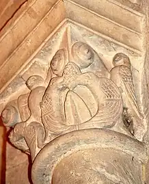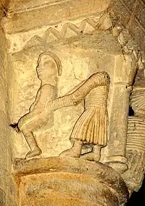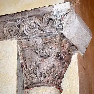 La sculpture du chapiteau nord de l'arc du chœur est exceptionnelle. Sur la face principale se trouve une créature féminine, hideuse et diabolique. Elle est nue, les deux paires de jambes écartées, son sexe bien visible et ses pieds en forme de serres. Au-dessus de sa tête une pomme de pin est suspendue et, sous ses pieds, des créatures serpentiformes s'enlacent.