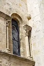 L'abside est percée de neuf baies. Chaque baie est couverte d'un arc en plein cintre qui retombe sur deux chapiteaux surmontant des colonnettes à base circulaire et moulurée. L'archivolte, quand elle existe, retombe sur une frise continue à double délardement, prolongeant les tailloirs, formant imposte.