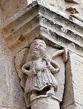- N°4 où on voit la tête d'un homme écrasée par le fardeau du poids d'une barrique qu'il porte sur les épaules (On trouve une représentation semblable sur un chapiteau de l'abside, où l'homme porte un poisson énorme sur les épaules.)
