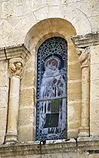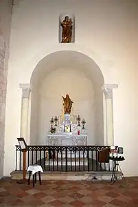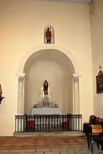 - La statue, en bois doré, de la Vierge aux bras écartés, sur une nuée, se trouve sur l'autel de l'absidiole nord. Elle est du XIXe siècle et inscrite[16] à l'I.G.P.C. Dans une niche, au-dessus de l'entrée de l'absidiole, se trouve une autre statue en bois doré, la Vierge à l'Enfant, qui date également du XIXe siècle.