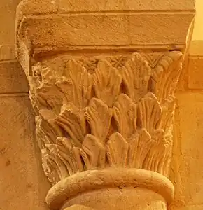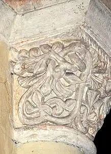 - Le tailloir du chapiteau est décoré avec un entrelacs simple de rinceaux et de feuilles.