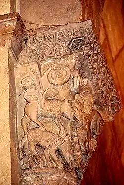 - Chapiteau sud : Ce chapiteau est un exemple remarquable du thème classique de l'art roman : des animaux fantastiques qui crachent des rinceaux. Sur chaque petite face se trouve un lion rampant, la tête tournée vers la face principale. Leurs queues, d'abord rentrantes, puis remontantes, deviennent fleurdelisées et se mélangent avec les rinceaux et feuilles que les lions crachent de la bouche.