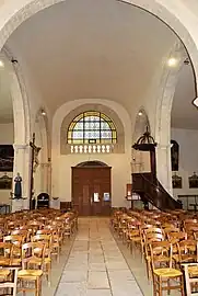 - Les Stalles, qui datent du XVIIIe siècle, sont inscrites[14] à titre d'objet. Il y a deux ensembles de deux stalles sans agenouilloir et une stalle qui en comporte un. Elles sont ornées sur les parcloses de volutes et d'acanthes et les miséricordes sont ornées de culots en feuilles d'acanthe. Des inscriptions sur les dossiers : FABRICIEN SECRETAIRE ; TRESORIER etc. laissent penser qu'elles étaient réservées aux membres du Conseil de fabrique.