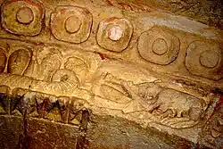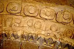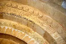 L'archivolte externe en ressaut s'orne d'une trentaine de soucoupes concaves, centrées par un besant. Certains de ces disques ont la forme de têtard, au-dessus de certains personnages clefs de la sarabande : la danseuse, le seigneur (deux), les bêtes de somme du laboureur et l'homme qui tient la queue du serpent dans la dernière séquence. La signification n'est pas évidente.