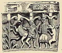 Les hommes sont des guerriers, revêtus du haubert intégral, mais au repos car sans armes. Celui de gauche brandit un serpent, qu'il écoute, comme un glaive. Sa main droite touche les cornes du quadrupède (bouc ou cerf). Le second guerrier, au lieu de repousser l'animal qui lui monte dessus, le salue, alors qu'une autre bête est en train d'engloutir son bras gauche.
