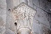 La corbeille d'un des chapiteaux du sud est entourée de feuilles à crochets. Un autre est formé de feuilles surmontées de raisins, avec un tailloir couvert d‘entrelacs.