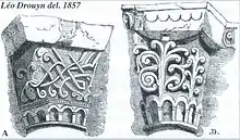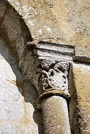 Sur l’un des chapiteaux, celui au nord, se trouvent quatre oiseaux se tournant le dos deux à deux, et, sur l’autre, des tiges entrelacées. Le tailloir de ce dernier est formé par un personnage bicorporé dont la tête couvre l’angle saillant du tailloir. Le costume de ce double corps se compose d’une simple tunique étroite du haut, large du bas, et assez courte pour laisser les jambes à découvert.