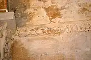 La seule trace de la religion chrétienne dans l'église est un chrisme scellé dans le mur occidental à 2 mètres du sol, préservé en limite de l'ajout du clocher au XIXe siècle.