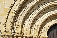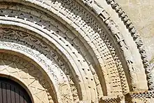 Chaque arc est composé de deux parties : de l’arc proprement dit formé d’une suite de claveaux, et, au-dessus, d’un cordon ou archivolte qui encadre les claveaux ; les arcs et les archivoltes sont couverts de sculptures de formes très variées.