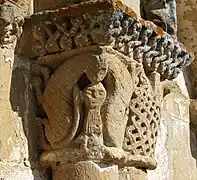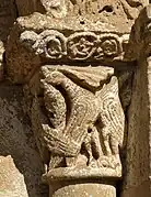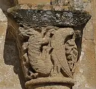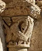 Le chapiteau est bi-facial. Il y a deux couples d'oiseaux adossés qui détournent leurs becs pour picorer une pigne (fruit de vie). Deux des oiseaux sont entiers et on peut voir que leurs pattes serrent des fruits sphériques, le fruit défendu ou malum et attribut de Satan. Ces oiseaux sont donc malfaisants.