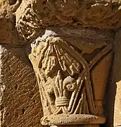 À l'ouest du chapiteau, un oiseau, et un homme bicorporé sur le tailloir et à l'est, l'ébauche d'un homme tenant une crosse en main. Sur le cordon oriental, un couple allongé. Deux hommes nus sont couchés l'un sur l'autre, tête-bêche. L'homme du dessus semble être un démon car il a des jambes velues, des pieds griffus et des cornes de satyre. L'homme du dessous porte une couronne de roi. Tous deux sont barbus, ils rient aux éclats et se tiennent par la main, comme des amoureux.