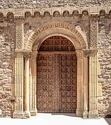 Le portail est de style roman. Il s'inscrit dans un cadre formé de deux pilastres, de colonnettes à chapiteaux ornés de feuillages et d'une guirlande de petites arcades[4].