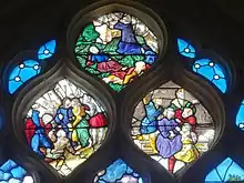 - La verrière dans la dernière travée du second bas-côté sud de la nef (n° 20) n'a pas de sujet fédérateur, et a vraisemblablement été recomposée à la base de bordures et divers fragments. Cette verrière est à trois lancettes trilobées, surmontées de deux losanges, d'un soufflet et de deux mouchettes. Les lancettes comportent, pour l'essentiel, du verre blanc et des bordures, ainsi qu'un écusson provenant de l'actuelle sacristie (de gueules à trois coquerelles d'or[46]) et un petit médaillon de grisaille. Il représente une femme assise et un homme sous ses pieds. À la bordure de ce médaillon, on lisait les mots : « Holopherne. Fortitudo ». Le soufflet contient des débris d'une Cène mal recomposés lors d'une restauration. Judas est encore reconnaissable par son habit jaune. L'abbé Marsaux indique que cette scène est souvent interprétée à tort comme les noces de Cana[47]. Dans les mouchettes, figurent des anges musiciens, et dans les losanges, des phylactères portent les mots « au commencement / était le verbe » (Jn 1,1).