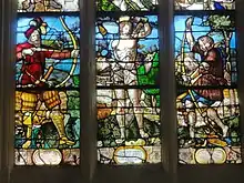 - La verrière de la Résurrection du Christ, au tout début du second bas-côté sud de la nef, s'insère dans un remplage identique identique à celui de la verrière de la Crucifixion ci-dessus, et est datable de 1574 grâce à une inscription sur la tranche du sépulcre. Au milieu, le Christ glorieux sort du tombeau sur une nuée, brandissant un étendard. À sa vue, les soldats préposés à sa garde sont frappés de terreur, et certains s'écroulent par terre ou se cachent les yeux. Ces soldats occupent les lancettes de gauche et de droite. En haut de la lancette de droite, l'on aperçoit également la silhouette d'un château, qui symbolise la ville de Jérusalem. Le tympan, dont les vitraux sont très assombris, offre trois sujets de la Passion du Christ. Ce sont la flagellation de Jésus par des soldats dont l'on remarque leur ignoble figure (en haut) ; le Couronnement d'épines (à gauche) ; et Jésus devant Ponce Pilate (à droite)[48].
