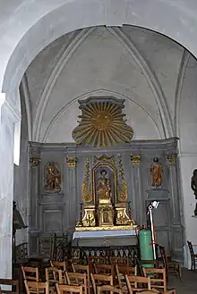 - Le retable imposant en bois naturel se compose de quatre colonnes corinthiennes cannelées et rudentées aux deux-tiers supérieurs. Elles soutiennent une épaisse corniche supportant au droit des colonnes des pots à feu et au centre un médaillon marqué du chiffre JHS. Les chapiteaux, les guirlandes et les rinceaux sont rehaussés de dorure.