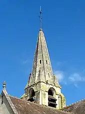 Deux contreforts plats flanquent chaque angle du premier étage. Ils sont scandés par la tablette déjà signalée, puis se retraitent par un court glacis au niveau du sommet des baies, et sont enfin scandés par une seconde tablette. Celle-ci fait également le tour du clocher, et sert d'appui des fenêtres du second étage de baies. Contrairement à nombre d'autres clochers romans de la région, les contreforts ne s'arrêtent pas au niveau du dernier étage, et se poursuivent jusqu'au niveau des impostes de ses fenêtres, où ils s'achèvent par un glacis. Les fenêtres de l'étage supérieur sont issues d'un remaniement au XVe siècle[5]. Avant, il y avait bien les deux baies par face habituelles, car les colonnettes d'extrémité et leurs chapiteaux subsistent encore en grande partie. La corniche sommaire qui termine l'étage de beffroi est également romane. Elle se compose de six corbeaux par face, qui sont moulurés d'un quart-de-rond dans l'échine. La flèche en pierre a été ajoutée vers le milieu du XIIe siècle. Elle est construite sur un plan octogonal, et chaque angle est garni d'un tore, qui retombe sur une tête grimaçante près de la corniche. Les faces de la pyramide sont percées de deux niveaux d'ouvertures rectangulaires, et les pierres sont en partie décorées de grosses dents de scie en bas-relief. La transition du plan carré vers le plan octogonal est racheté par quatre clochetons pyramidaux aux angles. Ils sont de plan carré, et sont sommés d'une boule tout comme la flèche principale. — Par sa corniche et son premier étage de baies, le clocher de Saint-Maximin est encore très proche du clocher de Rhuis, qui date du dernier quart du XIe siècle, et il n'est pas très éloigné des clochers de Saint-Aignan et Saint-Pierre de Senlis, qui remontent vers le milieu du même siècle. Des flèches semblables existent à Saintines et Villers-Saint-Frambourg, qui sont plus tassées et dépourvues de tores aux angles. La flèche de Chamant possède en revanche des tores retombant sur des chimères saillantes, mais est sinon plus évoluée.