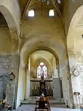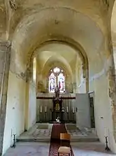Le sanctuaire, presque aussi sobre que les croisillons, offre la disposition exceptionnelle de la succession d'une voûte en berceau et d'une voûte d'arêtes. En effet, les voûtes d'arêtes sont plus habituellement employées pour les bases des clochers (Arthies, Boubiers, Chamant, Condécourt, Cormeilles-en-Vexin, Feucherolles, Follainville, Limetz, Moussy, Orgeval, Reilly, Saint-Gervais. Seraincourt, Tessancourt…). Les chœurs sont souvent voûtés en berceau à la période romane, mais peu d'exemples se sont conservés dans la région, où l'essor de l'architecture gothique est allé de pair avec la reconstruction de la plupart des chœurs romans. Restent encore Asnières-sur-Oise, Bray, Labruyère, Laigneville, Monchy-Saint-Éloi, l'ancienne chapelle du manoir de Rouffiac à Pontpoint[16], Rieux, Saint-Clair-sur-Epte, Santeuil, la première travée de la chapelle de la Vierge de Saint-Vaast-de-Longmont, etc. La voûte en berceau n'a pas de supports. Comme souvent à l'entrée des absides voûtes en cul-de-four, le diamètre de la voûte se réduit ici, mais il n'y a pas d'arc-doubleau à proprement parler. Néanmoins, un tore à vocation décorative a été disposé sous le ressaut de la voûte (et non devant, ce qui aurait pu le gommer), et le maître d'œuvre l'a fait retomber sur deux colonnettes à chapiteaux, dont la partie inférieure est tronquée. Les chapiteaux sont ronds, comme à la période rayonnante, mais ce semble plutôt être fortuit, car la facture est rustique, et la sculpture se limite à deux rangs de feuilles simples. Des chapiteaux existent aussi dans les angles du chevet. Ici, les tailloirs sont carrés, et ont le même profil sommaire que les impostes de la croisée du transept.