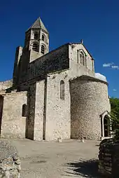 Au-dessus de l'abside occidentale, la partie haute de la façade occidentale, construite en pierre de taille, est ornée d'une fenêtre qui constitue un bel exemple d'art roman provençal inspiré de l'antique : cette fenêtre est encadrée d'élégantes colonnettes et surmontée d'un fronton supporté par des pilastres surmontés de chapiteaux à feuilles d'acanthe.