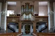 L'orgue de tribune : le buffet Franz Schädel (1777) abrite l'orgue Roethinger de 1962[5],[6],[7],[8].
