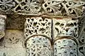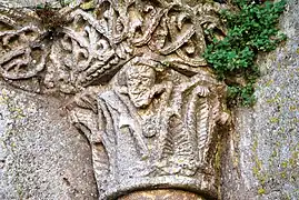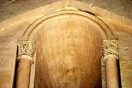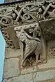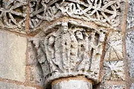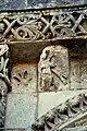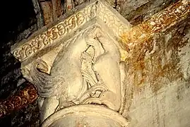 - Les chapiteaux de l’ébrasure nord représentent des griffons ou des lions ailés ; des feuillages ; des oiseaux qui picorent une pigne et des oiseaux dur le dos des lions. Au sud se trouvent des masques humaines et diaboliques au milieu des rinceaux.