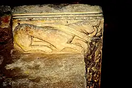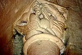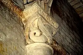 Les premiers arcs de la voûte retombent à droite sur un gros chapiteau roman décoré d'un énorme dragon ailé combattant un quadrupède.