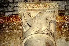 Sur le chapiteau oriental se trouve un dragon ailé à tête d'oiseau ou un griffon. Il picore une de ces ailes.