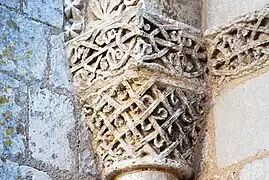 Sur le chapiteau oriental, deux créatures fantastiques se sont affrontées sur l'angle de la corbeille et sur le chapiteau occidental la décoration est un entrelacs simple.