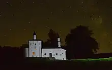 Photographie prise à la tombée de la nuit montrant une église à droite dominant un paysage avec un lac en bas à gauche.
