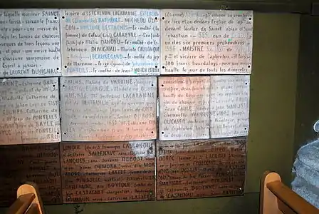 Sur les murs intérieurs de la nef sont accrochées des plaques gravées des noms des morts inhumés dans l’église[2]. Ces plaques de terre cuite et de bois tapissent sur trois rangées les bas-côtés de la nef, et elles portent gravés les noms des 1062 Capbretonnais inhumés dans l’église de 1533 à 1752.