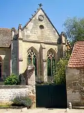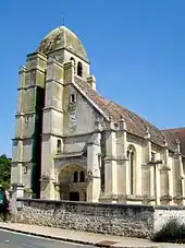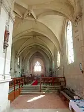 L'abside est tout à fait homogène avec la croisée du transept. Pour une superficie équivalente, elle se contente d'une seule voûte. La clé de voûte est un découpage flamboyant, dont le motif est un quadrilobe servant de support à un écusson aux armes de la famille de Guiry : d'argent aux trois quintefeuilles de sable[13]. Les lobes prennent la forme de soufflets. Aux quatre extrémités, figurent des fleurons. À part la clé de voûte, le décor architectural proprement dit est absent du chœur, à l'exception toutefois d'une minuscule niche double taillée dans un bloc de pierre unique, qui est encastrée dans le mur méridional. Le principal ornement du chœur sont les réseaux particulièrement riches des fenêtres, qui sont à trois lancettes et toutes les trois différentes dans leur partie supérieure. Au sud, on y trouve deux paires de soufflets dissymétriques affrontés, surmontés de trois petits soufflets, et flanqués d'étroites mouchettes. Au chevet, se répète le dessin de la fenêtre occidentale du croisillon sud. Il est assez conventionnel, et présente trois soufflets symétriques et d'étroites mouchettes. La fenêtre septentrionale combine des particularités de la fenêtre méridionale de droite du croisillon sud, et de la fenêtre méridionale de la troisième travée de la nef, à savoir des losanges entre les têtes tréflées des lancettes, et deux soufflets superposés accolés. Ce motif central de la partie haute du réseau est flanqué de deux autres soufflets. Il est à signaler que la fenêtre orientale conserve des fragments de vitraux de la limite XVe / XVIe siècle. Ils sont classés monument historique au titre objet depuis 1975. Il s'agit de cinq petits anges musiciens, de la tête d'un personnage non identifié, et de bordures peintes au jaune d'argent, ainsi que deux fois du monogramme IHS. Ces fragments ont été montés dans une vitrerie blanche moderne en 1957[14].
