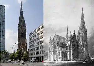 L'architecte anglais George Gilbert Scott, expert de la restauration des églises médiévales et fervent adepte du style gothique, fut chargé de dessiner un nouveau bâtiment. Il proposa un bâtiment pourvu d'une nef de 86 mètres de long, couverte d'une voûte de 28 mètres de haut. Son architecture fut fortement influencée par les styles gothiques français et anglais, bien que la flèche en pointe soit typiquement germanique. Le nombre de statues de grès et la flèche étaient assez inhabituels. La reconstruction commença en 1846, et l'église fut consacrée le . La flèche, haute de 147,30 mètres, fut achevée en 1874.