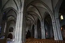 L'église comporte quatre vaisseaux, cette double nef évoquant les deux églises dont elle est issue : une église priorale au nord et l'église paroissiale au sud.