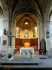 Sur le plan architectural, le chœur se résume à l'abside. Sur le plan liturgique, il commence par la croisée du transept. C'est ici que le nouveau maître-autel a été érigé à la suite de la réforme liturgique décidée par le concile Vatican II, qui veut que le prêtre officie face aux fidèles lors de la célébration eucharistique, et que l'autel soit avancé en direction de la nef. On aurait pu inclure la croisée du transept dans la nef des fidèles, mais ce n'est pas l'option qui a été retenue, et l'abside doit aujourd'hui être utilisée pour loger des fidèles. Elle perd ainsi sa vocation première de sanctuaire et son sens liturgique. En plus, l'ancien maître-autel a été supprimé, et cédé la place à l'orgue. Le Saint-Sacrement est abrité dans la chapelle du bas-côté sud, qui pourtant ne dispose pas d'un tabernacle, et c'est là que brûle la lampe éternelle pour symboliser la présence du Seigneur en son église.