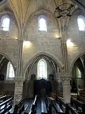 Les tailloirs sont suffisamment débordantes pour accueillir les bases des faisceaux de trois colonnettes, qui retombent depuis les chapiteaux du second ordre. Les socles sont polygonaux, et les bases aplaties. Les trois fûts sont de diamètre identique. Ils sont en délit, assemblés chacun d'une demi-douzaine de tronçons, et appliqués contre les murs hauts de la nef. C'est encore la marque d'une construction soignée, car les colonnettes pourraient être engagées dans le mur, et appareillées avec ceux-ci, à raison d'un bloc taillé par assise. Les chapiteaux du second ordre présentent des feuillages plus raffinés et sont l'œuvre d'un tailleur de pierre différent. Il a peut-être participé au chantier de l'abbaye de Maubuisson, qui se situe entre 1236 et 1244. S'il serait exagéré de parler de différence de style à propos des chapiteaux, c'est justifié pour les tailloirs, qui ne peuvent guère être antérieurs aux années 1230. Ce sont des tailloirs dits à bec, avec une pointe orientée vers la nef, et un seul tailloir recouvre le groupe de trois chapiteaux. On entre ici dans le registre du style gothique rayonnant, et la Sainte-Chapelle possède aussi des tailloirs à bec. La question des formerets est éludée par Louis Régnier. Les voûtes elles-mêmes datent en tout cas de la fin du XVe siècle ou de la première moitié du XVIe siècle, tout comme par ailleurs les culs-de-lampe dans les angles nord-ouest, sud-ouest et sud-est. ogives et formerets ont la même épaisseur, et adoptent le même profil prismatique et aigu. Les clés de voûte sont des médaillons, qui encadrent la figure en pied, sculpté en bas-relief, d'un personnage drapé. La polychromie éclatante pourrait suggérer une réfection moderne, mais elle est néanmoins d'origine. L'homme barbu et assis que l'on voit dans la première travée porte un objet, peut-être un parchemin, ce qui ne suffit pas pour l'identifier. Dans les autres travées, on voit saint Pierre, accompagné d'un P, et saint Ouen. En ce qui concerne les fenêtres, ce sont des lancettes simples en tiers-point, sans décoration. Elles ont probablement été refaites au XIXe siècle, mais devraient refléter l'état du milieu du XIIIe siècle[11].