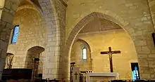 Le plan de l'église est complexe, traduisant les vicissitudes de son histoire. À l'est, on trouve une travée de chœur rectangulaire datant du XIIe siècle voûtée en berceau transversal. Le mur oriental constituant le chevet porte dans sa moitié sud un arc en décharge brisé montrant que l'ouvrage devait continuer vers l'est. Le chœur communique avec la nef côté sud par un arc en ogive. La nef côté sud peut remonter, elle aussi, au XIIe siècle. Au sud, une porte en plein cintre a été aveuglée.